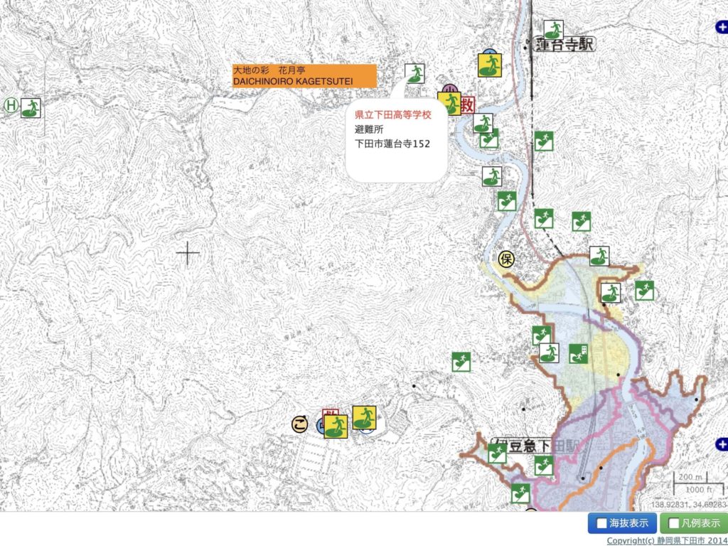 - 集合場所: 避難後は、下田高校グランドに集合してください。スタッフが点呼を行います。花月亭は海抜11mです。下田高校は海抜18mです。