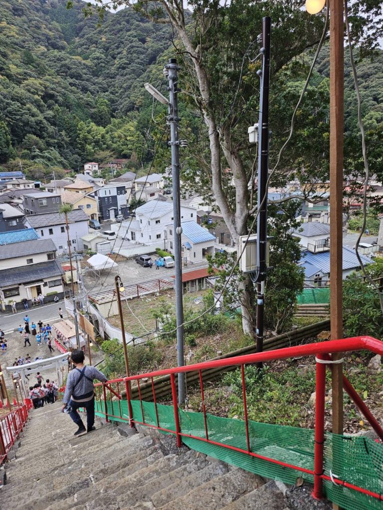 夜21時頃の神輿の「宮入」では、急な石段を一気に駆け上がる迫力の光景が楽しめます。