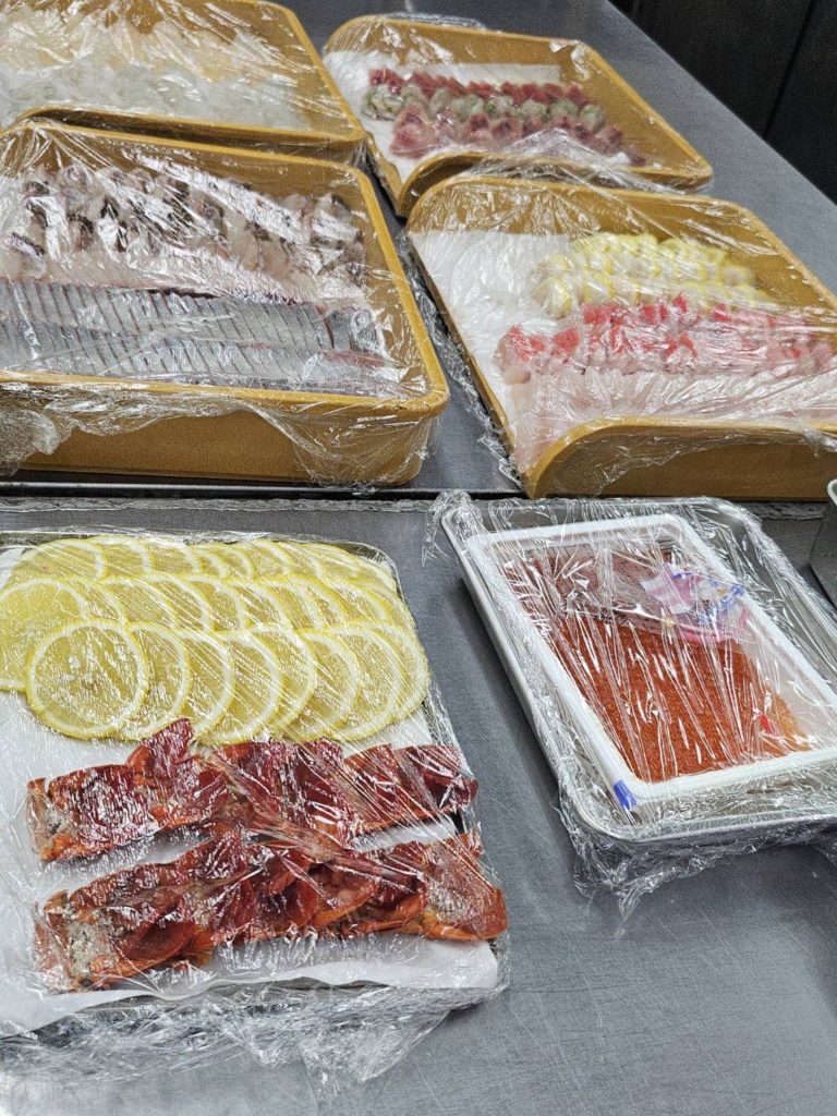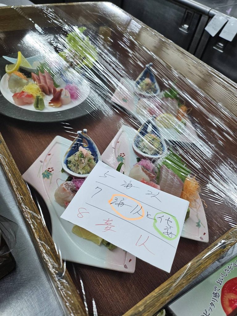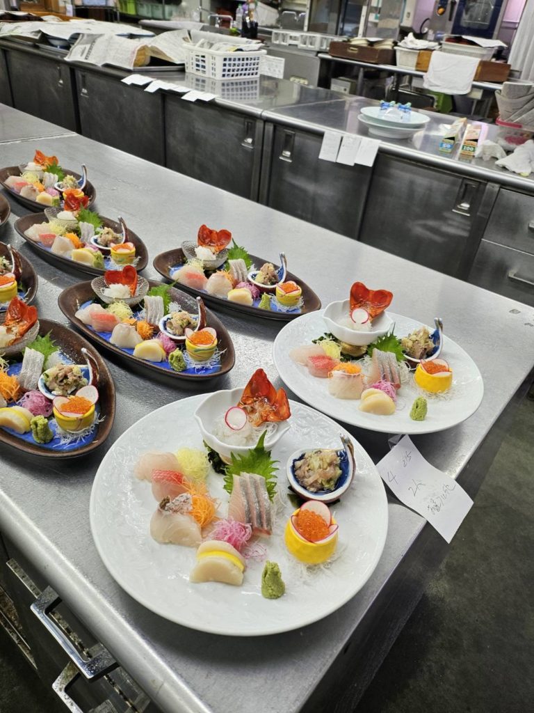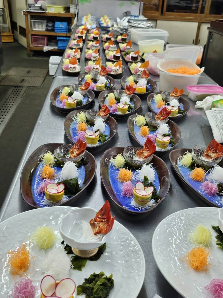 花月亭 厨房では、お造りや海老、鮑をはじめとしたさまざまな食材を仕込み、一皿ずつ盛り付けていきます。鮑の下処理や盛り込みなど、いくつもの工程を重ねながら、料理が少しずつかたちになっていきます。食事処では、お客様をお迎えする前に器やお料理を並べ、静かにお席を整えます。細かなところまで確認しながら、準備を進めています。華やかに並ぶ一皿の裏側には、こうした日々の積み重ねがあります。ご来館の際は、ぜひお食事の時間もゆったりとお楽しみください。